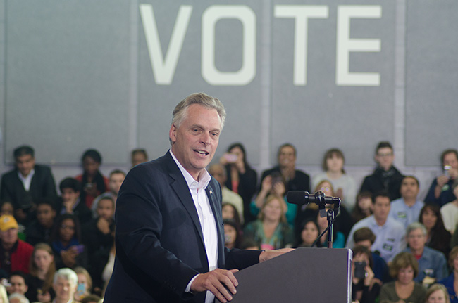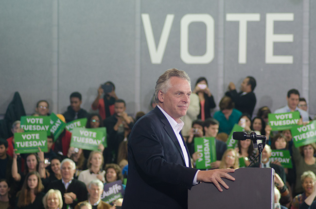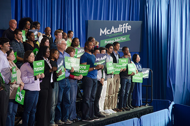 to State Sen. Creigh Deeds with 26% of the vote. "We are not going to forget that Ken Cuccinelli sided with the Tea Party against Virginia families," McAuliffe declared. He repeatedly contrasted "their Tea Party ticket" and "our mainstream ticket." McAuliffe said his supporters had knocked on 175,000 doors on Saturday (Nov. 2), and 1,770,000 doors since Jan. 1. |