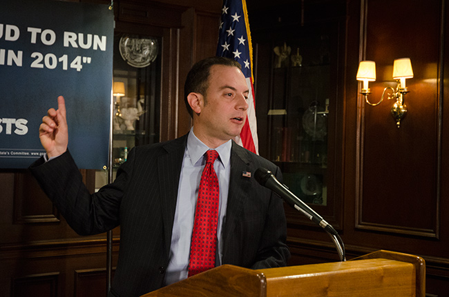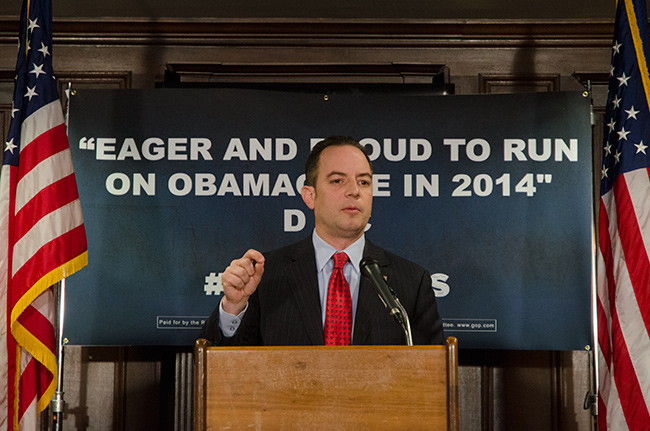 Nov. 21, 2013--The trouble-plagued rollout of Obamacare/the Affordable Care Act is providing a boost to Republican efforts to defeat vulnerable Democrats in 2014 races. Republican National Committee chairman Reince Priebus invited forty Democratic Senators and congressmen to a "We're Running On ObamaCare" press conference. None of the officials showed up. Priebus declared, "We will make 2014 about Obamacare, and yes we will tattoo Obamacare on each of their foreheads, and that will be what 2014 is all about.” |