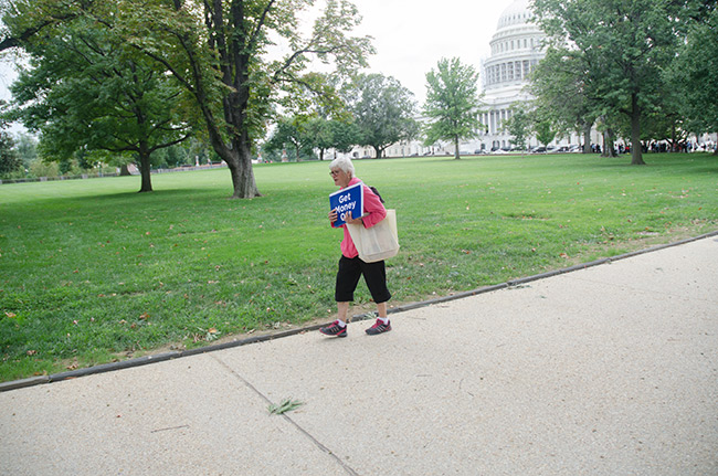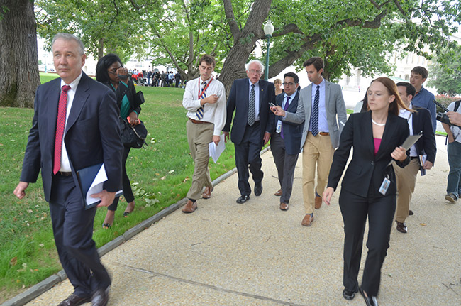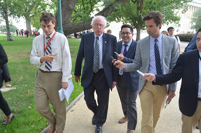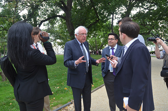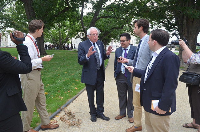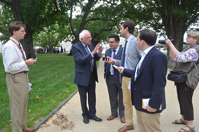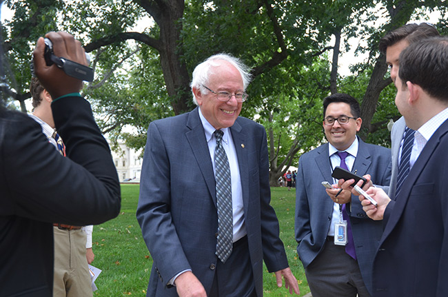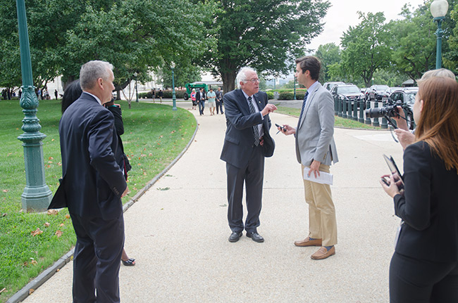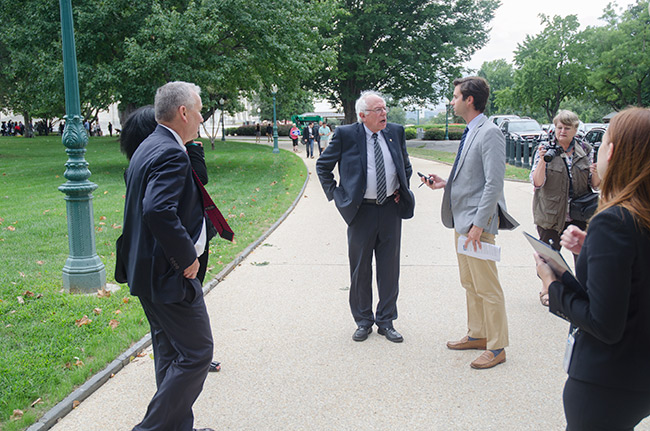 | Sept. 8, 2014 - Sen. Bernie Sanders (I-VT) talks with reporters after the event. He called the effort to rein in big money in campaigns “the major issue of our time.” |