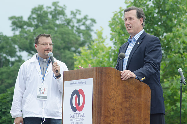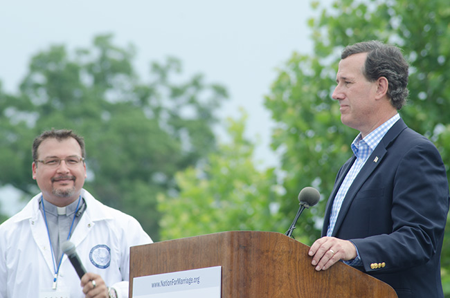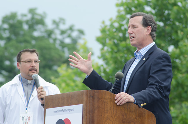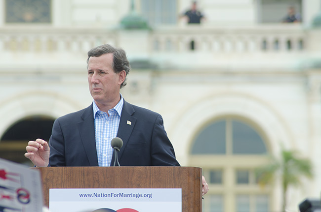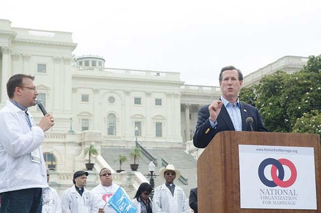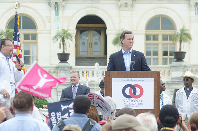 Santorum's remarks (transcript): "This is a movement like the pro-life movement. It is based in love. This is a movement based in love for what is best for children and families in America. People from across the ideological spectrum will all admit that marriage between a man and a woman is best for raising children and building strong communities. So why do we have such disagreement in America today? The reason we have such disagreement in America is because of the definition of marriage. And I mean definition not between same-sex couples and heterosexual couples; I mean the definition of what marriage is. Marriage is not just a romantic relationship between two people. Marriage is much, much, much more than that. But let's face it, over the past 50 years we have seen marriage be redefined, and we can't blame those who want to move same-sex marriage for that redefinition. We are the ones to blame. And so first and foremost in this movement we have to reclaim marriage for what it is. Marriage is the union of a man and a woman--it is the union between a man and a woman for the purpose of taking two people as one, a unity, and secondly to have and raise children. No other union can accomplish those two [inaud.] So what I have said repeatedly, that if marriage is simply a romantic relationship between two people then anybody should be able to get married. But that's not what marriage is. So it is important for us in the fight to redefine marriage to first reclaim the institution of marriage. And that is on us. That is on us to go out and talk about the importance of marriage for children, for men and for women. It's also important to understand how marriage is important for our economy. Every marriage, every family is a little business. How much easier is it to run a business with two people in the business as opposed to one? We need to help rebuild marriage of men and women coming together to raise our children. And we need to do this first and foremost with respect for all people. This isn't about hating anybody or anything. This is about loving truth and loving what's best for men, women and children. Thank you and God Bless you." Note: Former Gov. Mike Huckabee was another big-name politicial leader to address the rally. |