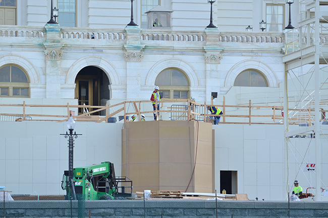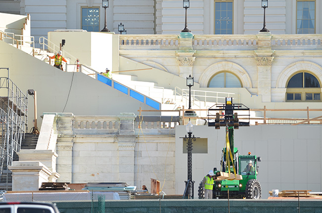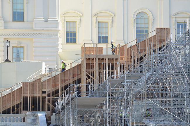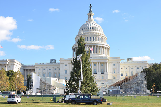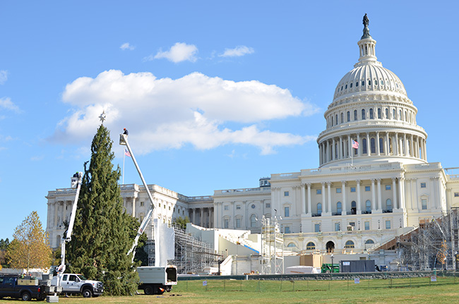 | Dec. 1, 2016--Work continues on construction of the Inaugural Platform at the Capitol, while in the foreground workers decorate the Capitol Christmas trea, an 80-foot Engelmann spruce from Idaho’s Payette National Forest. |