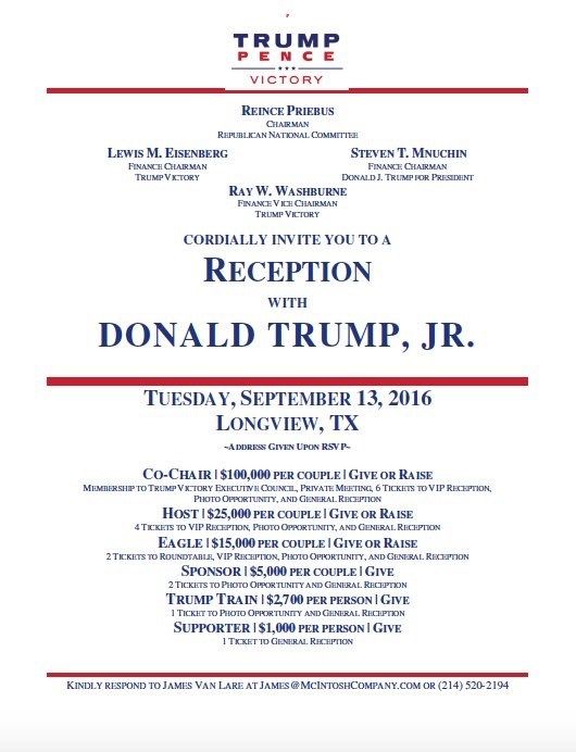 September 21 Ivanka Trump -Luncheon fundraiser in Dallas, TX. ($) September 17 Donald Trump -Speaks to the families of victims of illegal aliens and their supporters at Remembrance Project luncheon at the Omni Houston Hotel at Westside in Houston, TX (+). September 12-13 Donald Trump Jr. September 12 -Fundraiser in Midland, TX. ($) September 13 -Fundraiser in Longview, TX. ($) -Fundraiser in San Antonio, TX. ($) |